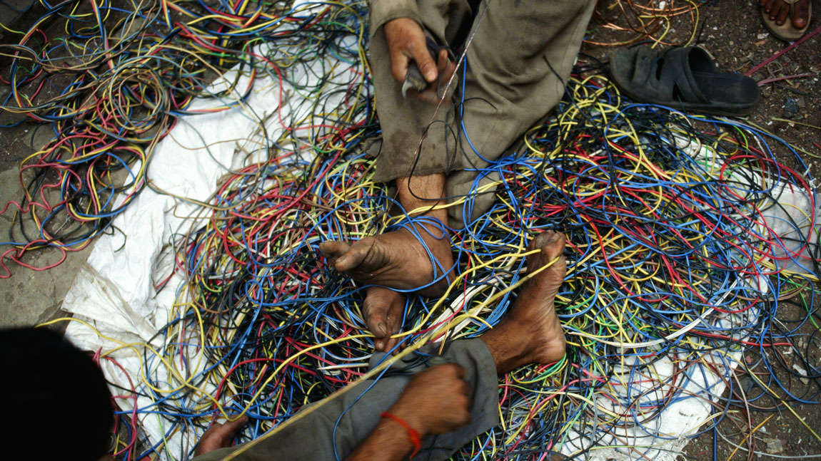 Zwei Männer am Straßenrand schauen mir schmunzelnd bei meinen Ausweichmanövern zu. Sie sitzen auf einem bunten Haufen von Kabel. In mühseliger Handarbeit trennen die beiden die Kabel in Metall und Plastik. Dafür klemmen sie die Schnüre zwischen ihre Zehen, schneiden mit einem alten Messer die Kabel auf und lösen die Kunststoffhülle vom glänzenden Inhalt. Das Metall wird später eingesammelt und ebenfalls eingeschmolzen.