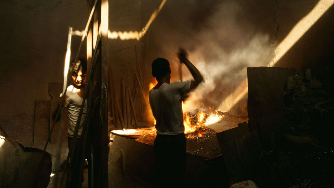 Einige Gassen weiter: Große Säcke, mit Aluminiumspänen gefüllt, ziehen meine Aufmerksamkeit auf sich. Hinter einer schmalen Wellblechwand befindet sich eine Feuerstelle, in deren Mitte ein großer Schmelztiegel steht. Zwei Arbeiter halten abwechselnd das lodernde Feuer in Gang, sorgen für eine ausreichende Luftzufuhr und führen dem Tiegel unter eindrucksvollem Auflodern der Flammen immer wieder Aluminiumspäne zu. Der Rauch kann nur begrenzt durch die Schlitze im Dach entweichen. Es ist heiß und stickig. „Was machst du hier?“, fragt einer. Die beiden Männer sind überrascht, mich in ihrer Werkstatt anzutreffen.
