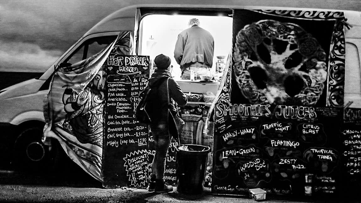 Die Camper haben den Kaffeeverkäufer Camden angelockt: Er tourt mit seinem Bulli durch England, um bei Festivals Heißgetränke zu verkaufen.