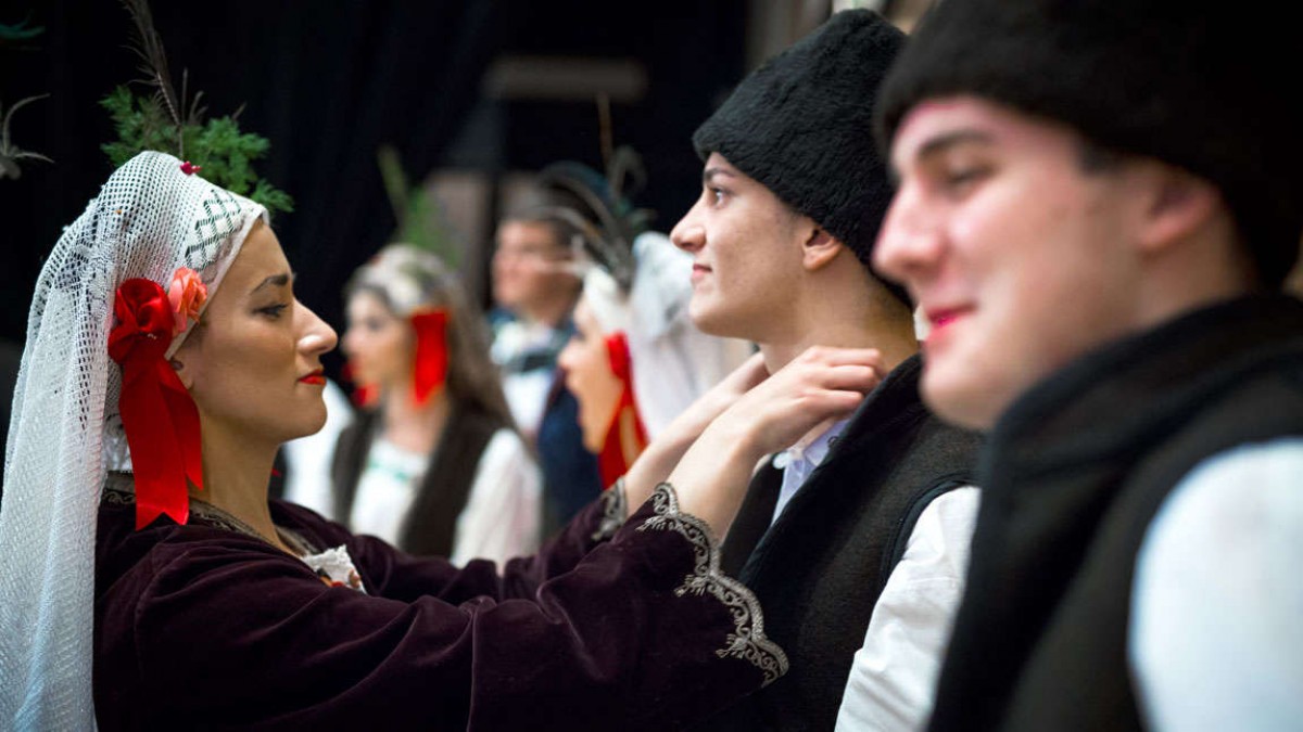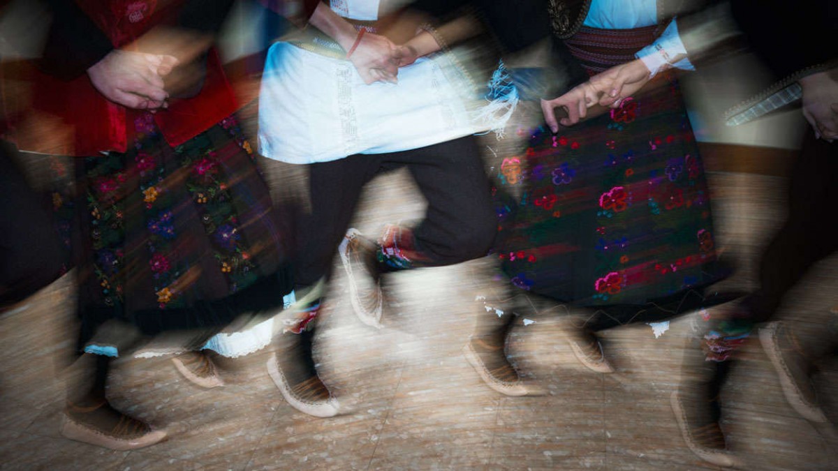 Nach stundenlangem Warten und Vorbereiten ist es soweit: Die EM-Sieger sind an der Reihe. Als die Gruppe die Bühne betritt, stimmen die Musiker des Vereins mit Trommel, Ziehharmonika und Flöte die Melodie eines vlachischen Liedes an. 20 Personen bewegen sich in gleichem Tempo, die bunt bestickten Trachten der Mädchen schwingen in der Luft. Ledersandalen berühren kurz den Boden, bevor sie wieder in die Höhe schnellen.