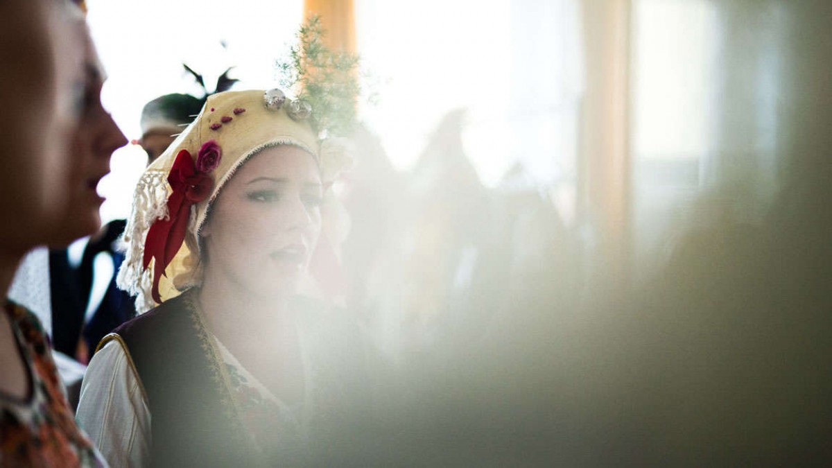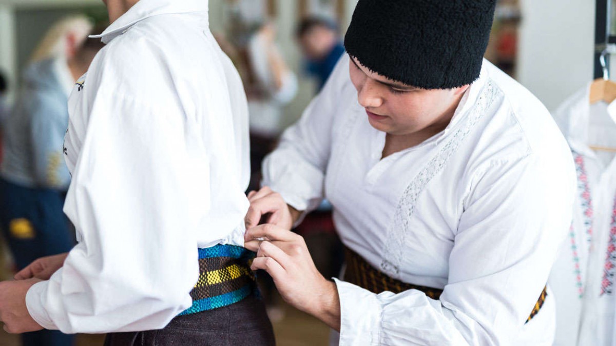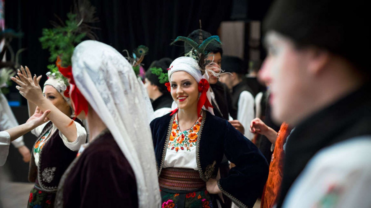 Um sie herum herrscht reges Treiben. In der einen Ecke der Garderobe stehen ein paar Jungs, schlüpfen in weiße, mit Blumen bestickte Hemden und helfen sich gegenseitig beim Festmachen des Bauchgürtels. Sie atmen tief ein und halten die Luft an, der Gürtel muss hauteng sitzen. Auf der anderen Seite probt eine Gruppe von stark geschminkten und in Trachten gekleidete Mädchen ein altes serbisches Volkslied.