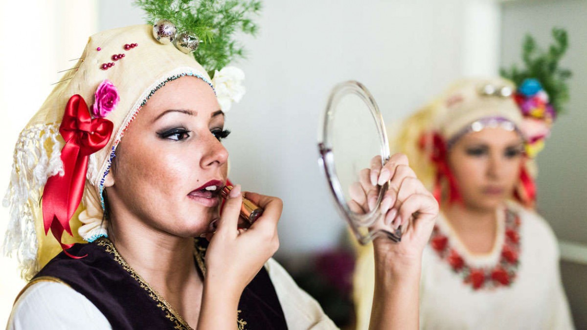 Suzana richtet sich auf, blickt strahlend in ihr Spiegelbild und erneuert ihren pinken Lippenstift. Bis sie so aussieht, wie es für den Auftritt gedacht ist, braucht sie mindestens eine Stunde. „Das Anziehen und Schminken geht eigentlich schnell, die Frisur kostet am meisten Zeit“, so die 19-Jährige. Obwohl der Gesang im Hintergrund eine beruhigende Wirkung hat, ist die Stimmung im Umkleidezimmer konzentriert und angespannt. Eine der Sängerinnen läuft nervös im Raum hin und her, übt immer wieder den Text ein. „Sie ist aufgeregt, weil sie zum ersten Mal auf der Bühne singen wird“, erklärt Suzana.